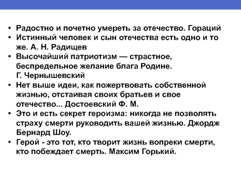 Радостно и почетно умереть за отечество. ГорацийИстинный человек и сын отечества есть одно и то же. А. Н. РадищевВысочайший патриотизм — страстное, беспредельное желание блага Родине.