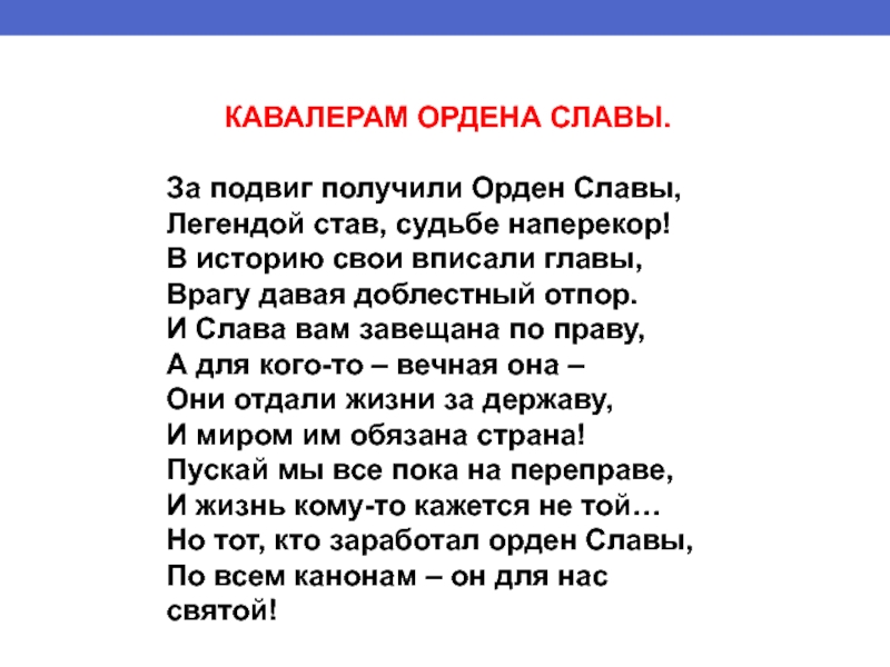 Пускай мы все пока на переправе, И жизнь кому-то кажется не той… Но тот, кто заработал орден Славы, По всем канонам – он для нас святой!