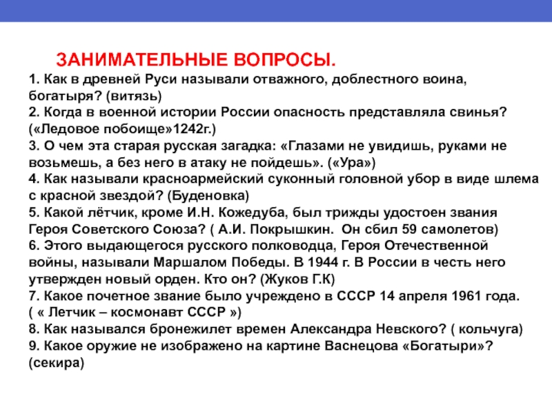 ЗАНИМАТЕЛЬНЫЕ ВОПРОСЫ.1. Как в древней Руси называли отважного, доблестного воина, богатыря? (витязь)2. Когда в военной истории России