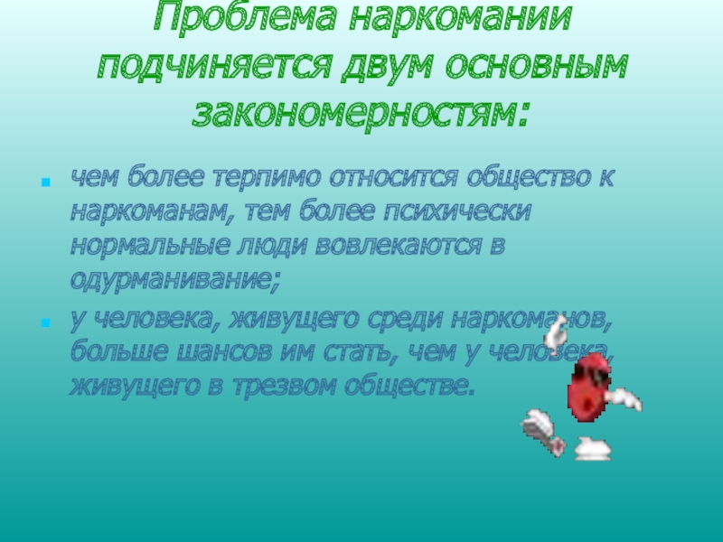 Слайд 5Проблема наркомании подчиняется двум основным закономерностям: