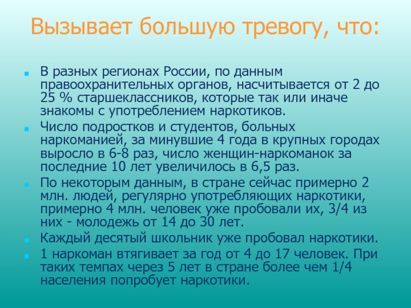 Вызывает большую тревогу, что: В разных регионах России, по данным правоохранительных органов, насчитывается от 2 до 25 % старшеклассников, которые так или иначе знакомы с употреблением наркотиков. Число подростков и студентов, больных наркоманией, за минувшие 4 года