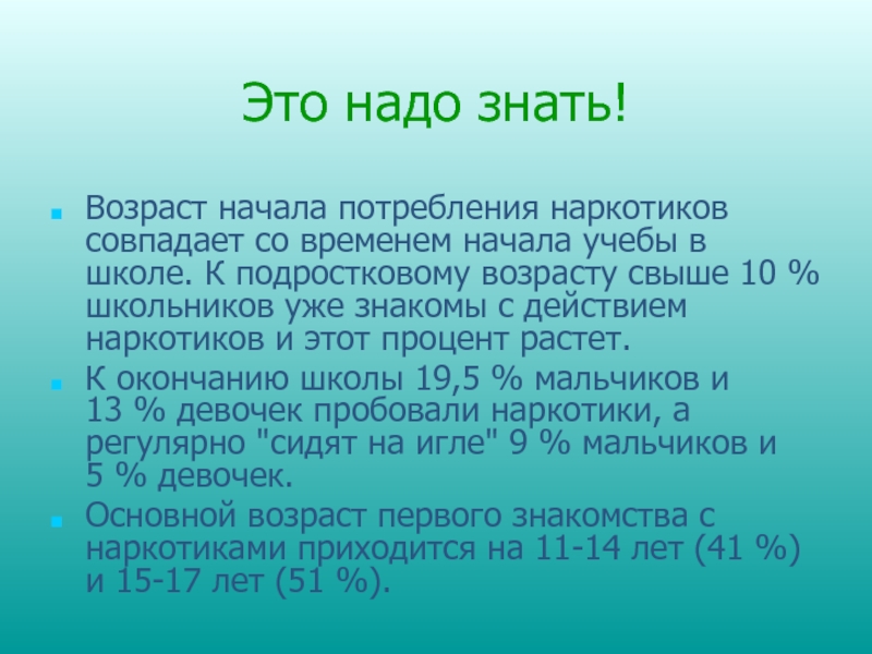 Это надо знать!Возраст начала потребления наркотиков совпадает со временем начала учебы в школе. К подростковому возрасту свыше