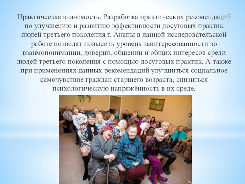 практик людей третьего поколения г. Анапы в данной исследовательской работе позволят повысить уровень заинтересованности во взаимопонимании, доверии, общении и общих интересов среди людей третьего поколения с помощью досуговых практик. А также при применениях данных рекомендаций улучшиться социальное самочувствие граждан старшего возраста, снизиться психологическую напряжённость в их среде.