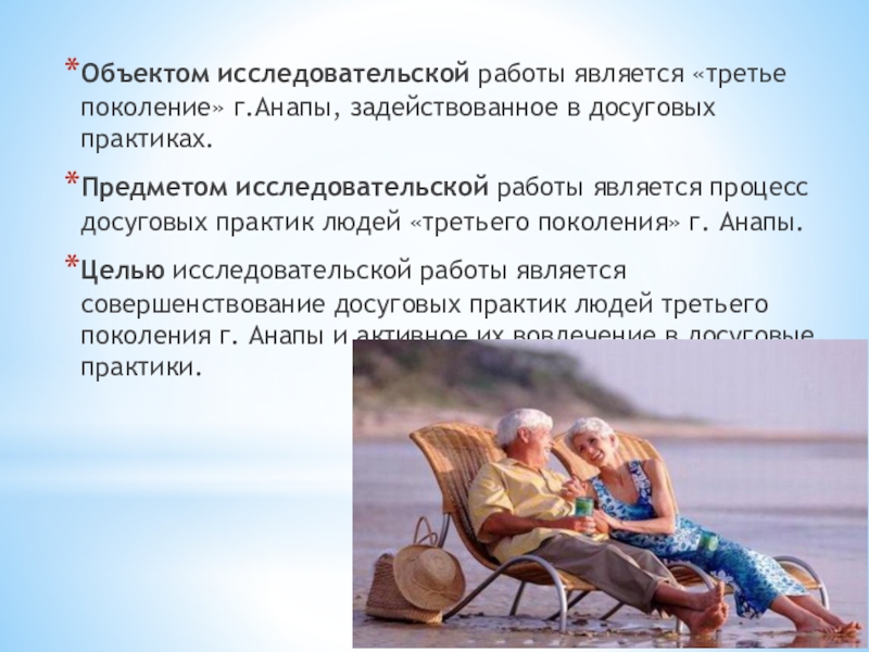 Слайд 3Объектом исследовательской работы является «третье поколение» г.Анапы, задействованное в досуговых практиках.