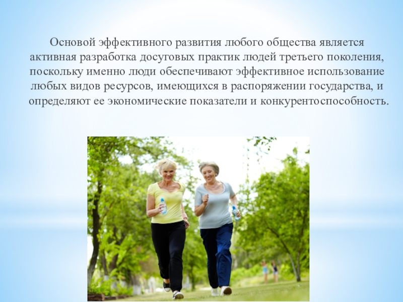 Основой эффективного развития любого общества является активная разработка досуговых практик людей третьего поколения, поскольку именно люди обеспечивают