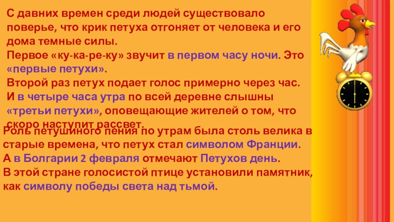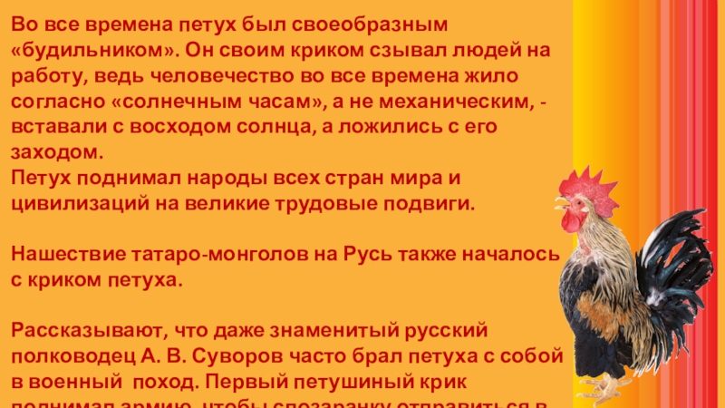 Слайд 5Во все времена петух был своеобразным «будильником». Он своим криком сзывал