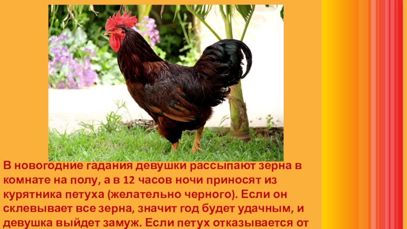 в 12 часов ночи приносят из курятника петуха (желательно черного). Если он склевывает все зерна, значит год будет удачным, и девушка выйдет замуж. Если петух отказывается от еды, то ничего особенного не произойдет.