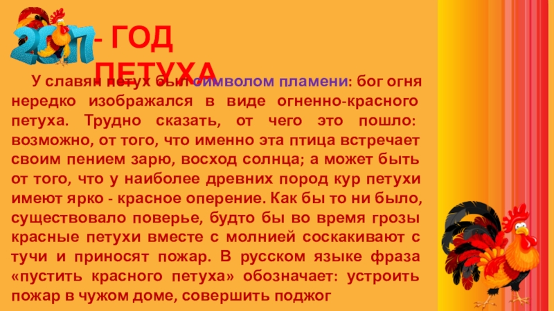 изображался в виде огненно-красного петуха. Трудно сказать, от чего это пошло: возможно, от того, что именно эта птица встречает своим пением зарю, восход солнца; а может быть от того, что у наиболее древних пород кур петухи имеют ярко - красное оперение. Как бы то ни было, существовало поверье, будто бы во время грозы красные петухи вместе с молнией соскакивают с тучи и приносят пожар. В русском языке фраза «пустить красного петуха» обозначает: устроить пожар в чужом доме, совершить поджог