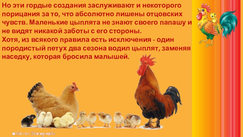 Слайд 8Петух - вожак куриного царства. Свой голос петух подает и днем.