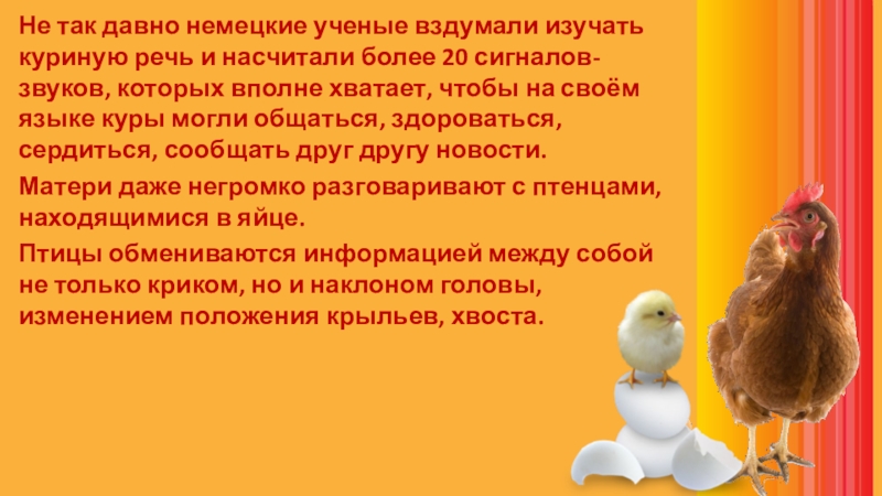 Слайд 15Не так давно немецкие ученые вздумали изучать куриную речь и насчитали