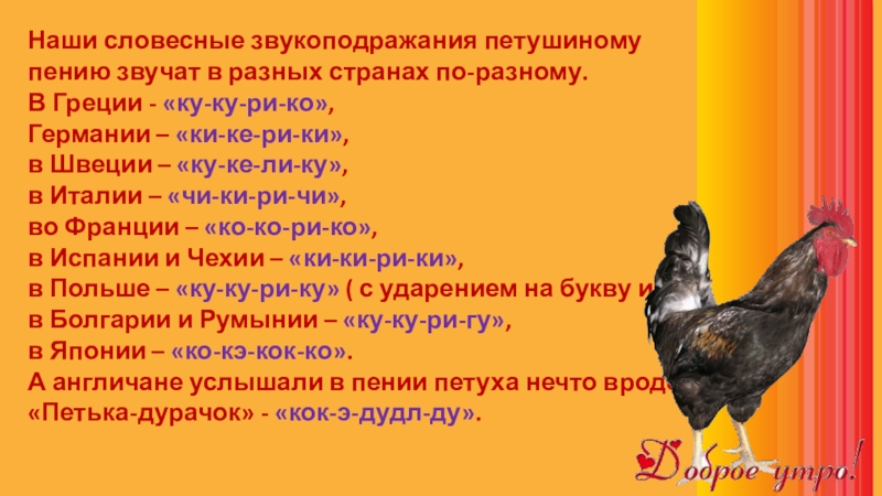 Слайд 7Наши словесные звукоподражания петушиному пению звучат в разных странах по-разному.