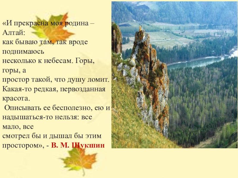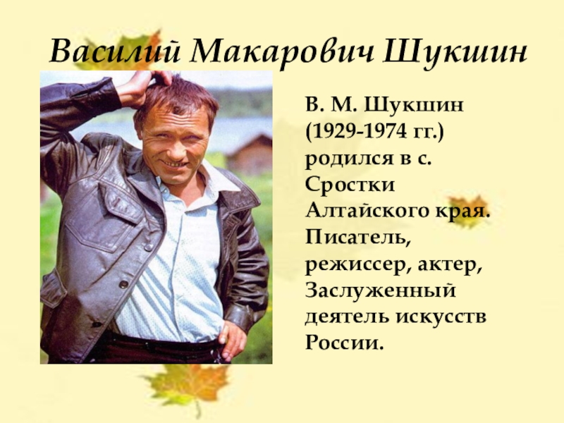 В. М. Шукшин (1929-1974 гг.) родился в с. Сростки Алтайского края. Писатель, режиссер, актер, Заслуженный деятель искусств России.
