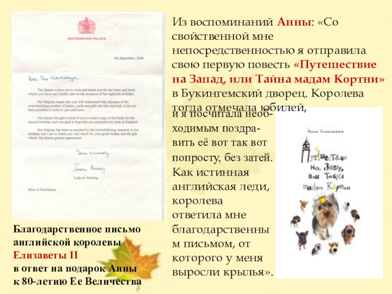 Из воспоминаний Анны: «Со свойственной мне непосредственностью я отправила свою первую повесть «Путешествие на Запад, или Тайна мадам Кортни» в Букингемский дворец. Королева тогда отмечала юбилей,