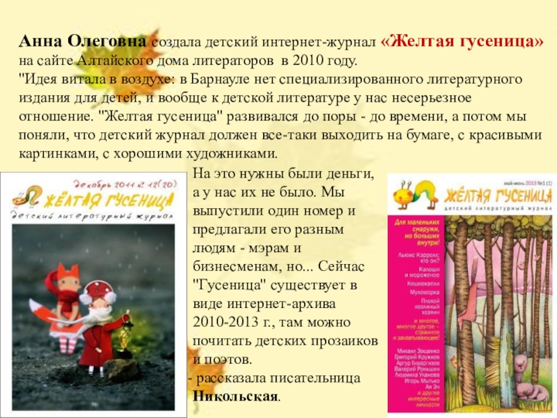 На это нужны были деньги, а у нас их не было. Мы выпустили один номер и предлагали его разным людям - мэрам и бизнесменам, но... Сейчас "Гусеница" существует в виде интернет-архива 2010-2013 г., там можно почитать детских прозаиков и поэтов.