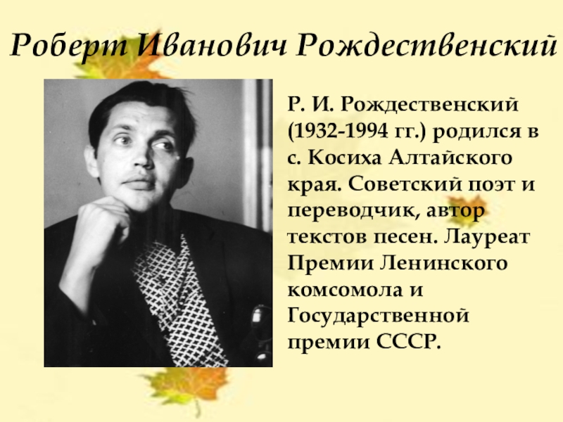 (1932-1994 гг.) родился в с. Косиха Алтайского края. Советский поэт и переводчик, автор текстов песен. Лауреат Премии Ленинского комсомола и Государственной премии СССР.