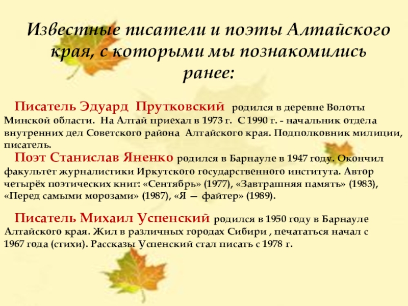 Известные писатели и поэты Алтайского края, с которыми мы познакомились ранее: