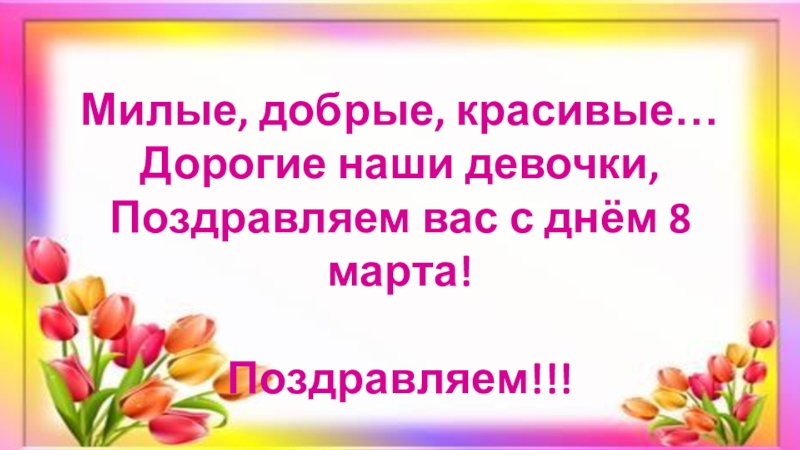 Милые, добрые, красивые…Дорогие наши девочки,Поздравляем вас с днём 8 марта!Поздравляем!!!