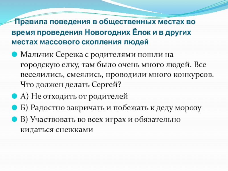 Мальчик Сережа с родителями пошли на городскую елку, там было очень много людей. Все веселились, смеялись, проводили много конкурсов. Что должен делать Сергей?