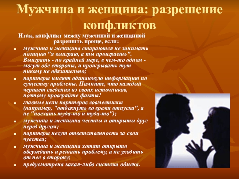 Слайд 10Мужчина и женщина: разрешение конфликтов