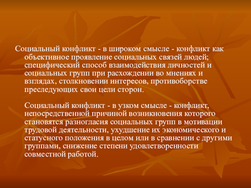 Социальный конфликт - в узком смысле - конфликт, непосредственной причиной возникновения которого становятся разногласия социальных групп в мотивации трудовой деятельности, ухудшение их экономического и статусного положения в целом или в сравнении с другими группами, снижение степени удовлетворенности совместной работой.