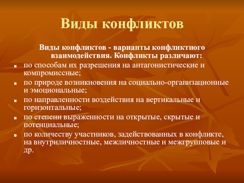 Виды конфликтов - варианты конфликтного взаимодействия. Конфликты различают: