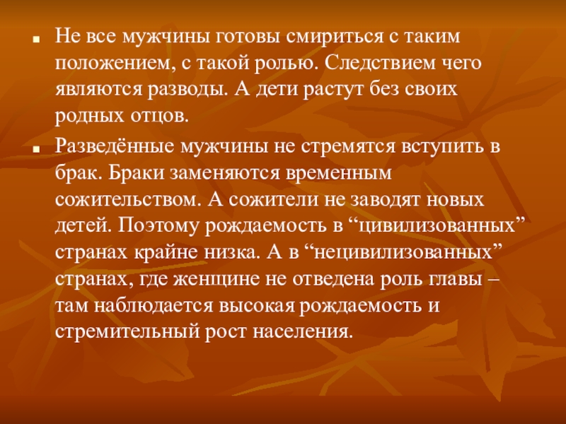 Разведённые мужчины не стремятся вступить в брак. Браки заменяются временным сожительством. А сожители не заводят новых детей. Поэтому рождаемость в “цивилизованных” странах крайне низка. А в “нецивилизованных” странах, где женщине не отведена роль главы – там наблюдается высокая рождаемость и стремительный рост населения.