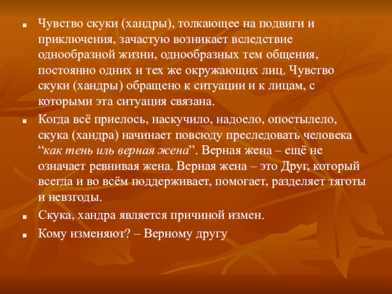 однообразной жизни, однообразных тем общения, постоянно одних и тех же окружающих лиц. Чувство скуки (хандры) обращено к ситуации и к лицам, с которыми эта ситуация связана.