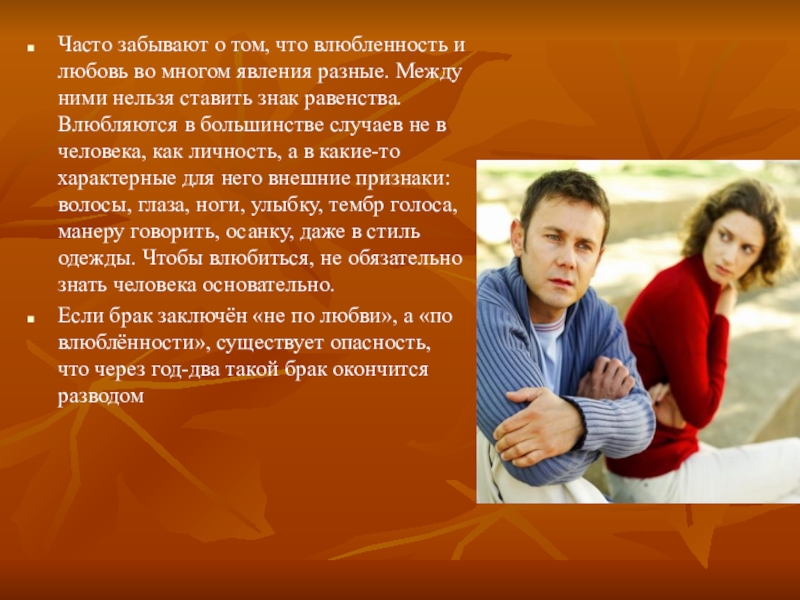 Если брак заключён «не по любви», а «по влюблённости», существует опасность, что через год-два такой брак окончится разводом
