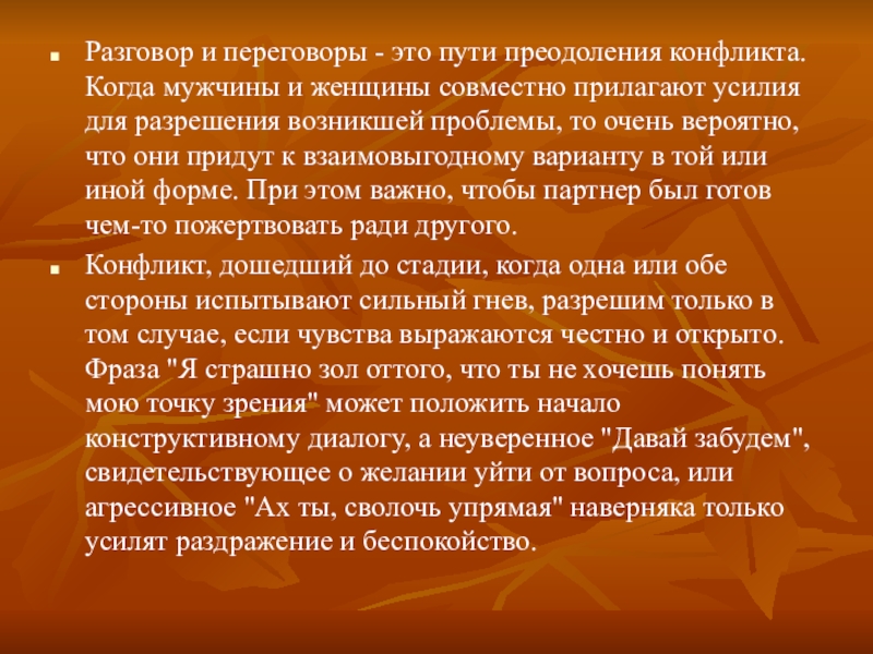 Разговор и переговоры - это пути преодоления конфликта. Когда мужчины и