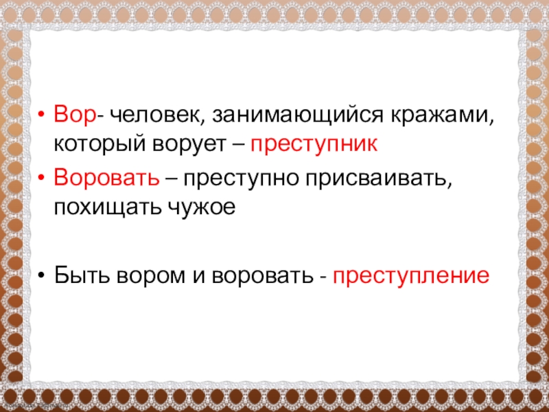 Слайд 4Вор- человек, занимающийся кражами, который ворует – преступник
