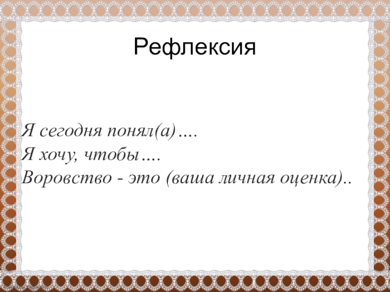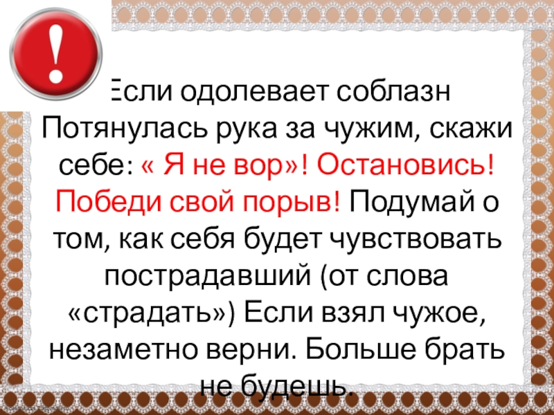 вор»! Остановись! Победи свой порыв! Подумай о том, как себя будет чувствовать пострадавший (от слова «страдать») Если взял чужое, незаметно верни. Больше брать не будешь.
