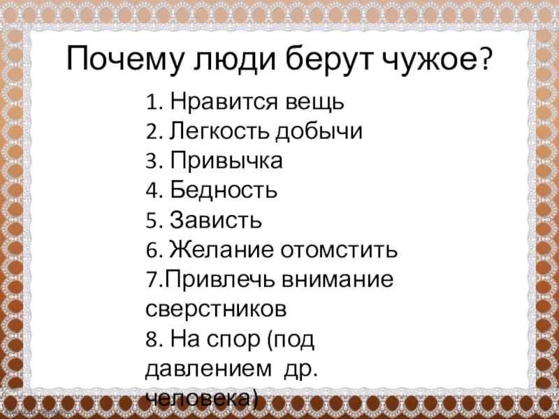 Слайд 7Почему люди берут чужое?