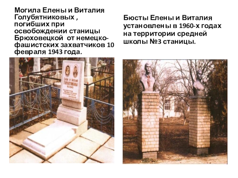 Бюсты Елены и Виталия установлены в 1960-х годах на территории средней школы №3 станицы.