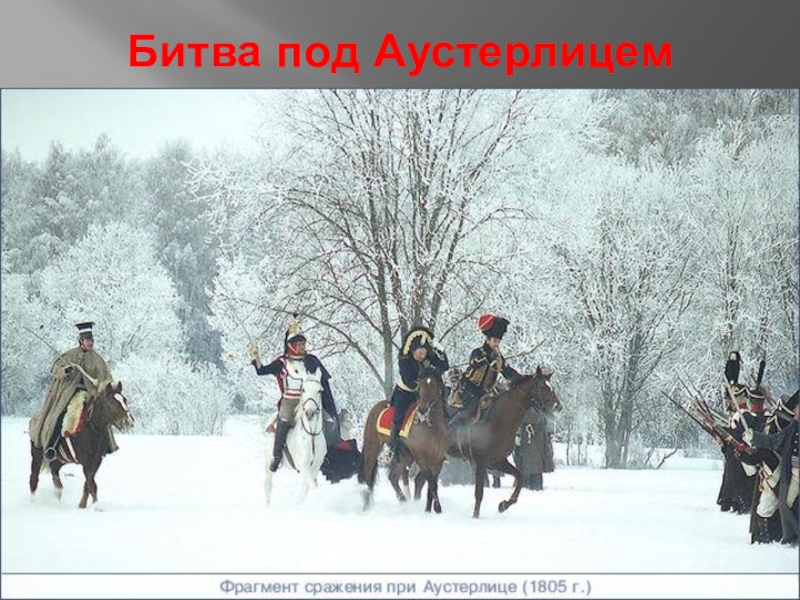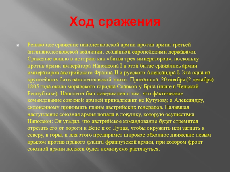 европейскими державами. Сражение вошло в историю как «битва трех императоров», поскольку против армии императора Наполеона I в этой битве сражались армии императоров австрийского Франца II и русского Александра I. Эта одна из крупнейших битв наполеоновской эпохи. Произошла 20 ноября (2 декабря) 1805 года около моравского городка Славков-у-Брна (ныне в Чешской Республике). Наполеон был осведомлен о том, что фактическое командование союзной армией принадлежит не Кутузову, а Александру, склоненному принимать планы австрийских генералов. Начавшая наступление союзная армия попала в ловушку, которую осуществил Наполеон: Он угадал, что австрийское командование будет стремится отрезать его от дороги к Вене и от Дуная, чтобы окружить или загнать к северу, в горы, и для этого предпримет широкое обходное движение левым крылом против правого фланга французской армии, при котором фронт союзной армии должен будет неминуемо растянуться.