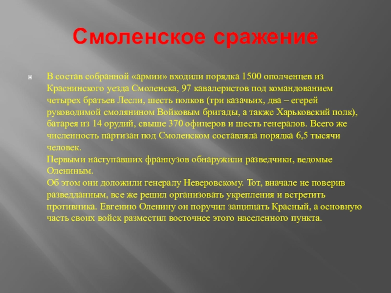 Краснинского уезда Смоленска, 97 кавалеристов под командованием четырех братьев Лесли, шесть полков (три казачьих, два – егерей руководимой смолянином Войковым бригады, а также Харьковский полк), батарея из 14 орудий, свыше 370 офицеров и шесть генералов. Всего же численность партизан под Смоленском составляла порядка 6,5 тысячи человек.