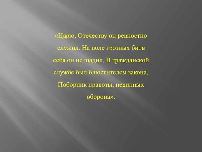 не щадил. В гражданской службе был блюстителем закона. Поборник правоты, невинных оборона».