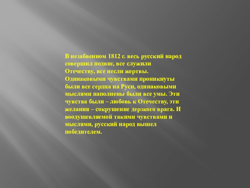 Слайд 13В незабвенном 1812 г. весь русский народ совершил подвиг, все служили