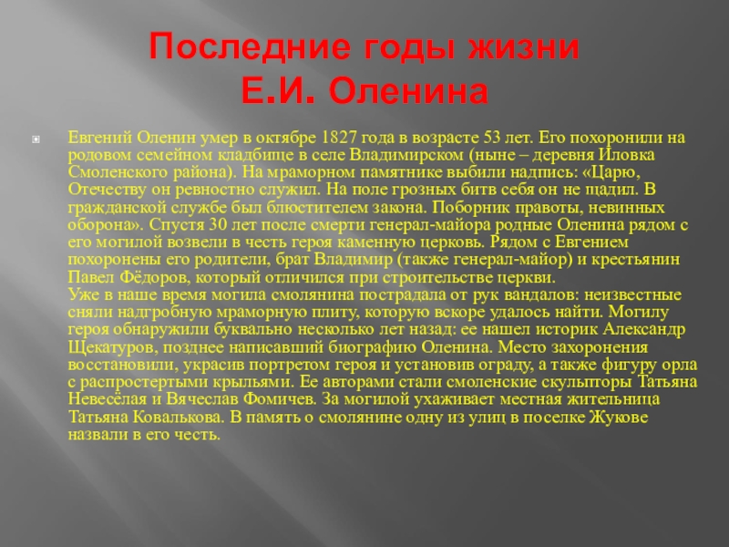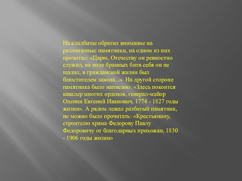 прочитал: «Царю, Отечеству он ревностно служил, на поле бранных битв себя он не щадил, в гражданской жизни был блюстителем закона...». На другой стороне памятника было написано: «Здесь покоится кавалер многих орденов, генерал-майор Оленин Евгений Иванович, 1774 - 1827 годы жизни». А рядом лежал разбитый памятник, но можно было прочитать: «Крестьянину, строителю храма Федорову Павлу Федоровичу от благодарных прихожан, 1830 - 1906 годы жизни»