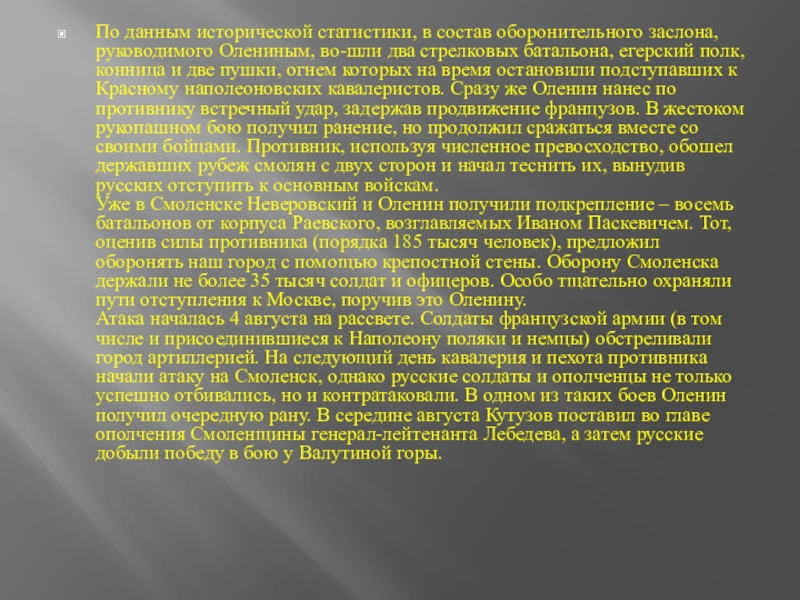 Слайд 41По данным исторической статистики, в состав оборонительного заслона, руководимого Олениным, во-шли
