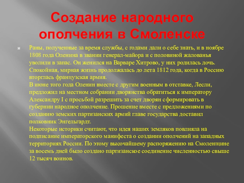 В июне того года Оленин вместе с другим военным в отставке, Лесли, предложил на местном собрании дворянства обратиться к императору Александру I с просьбой разрешить за счет дворян сформировать в губернии народное ополчение. Прошение вместе с предложениями по созданию земских партизанских армий главе государства доставил полковник Энгельгардт.