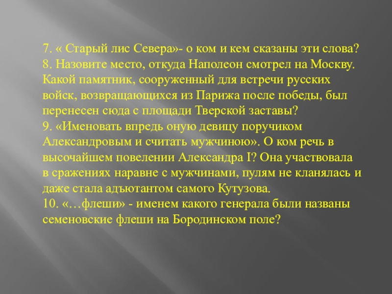 9. «Именовать впредь оную девицу поручиком Александровым и считать мужчиною». О ком речь в высочайшем повелении Александра I? Она участвовала в сражениях наравне с мужчинами, пулям не кланялась и даже стала адъютантом самого Кутузова.