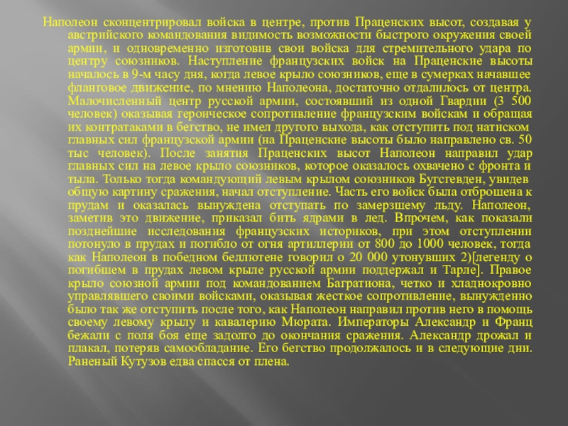 командования видимость возможности быстрого окружения своей армии, и одновременно изготовив свои войска для стремительного удара по центру союзников. Наступление французских войск на Праценские высоты началось в 9-м часу дня, когда левое крыло союзников, еще в сумерках начавшее фланговое движение, по мнению Наполеона, достаточно отдалилось от центра. Малочисленный центр русской армии, состоявший из одной Гвардии (3 500 человек) оказывая героическое сопротивление французским войскам и обращая их контратаками в бегство, не имел другого выхода, как отступить под натиском главных сил французской армии (на Праценские высоты было направлено св. 50 тыс человек). После занятия Праценских высот Наполеон направил удар главных сил на левое крыло союзников, которое оказалось охвачено с фронта и тыла. Только тогда командующий левым крылом союзников Бугсгевден, увидев общую картину сражения, начал отступление. Часть его войск была отброшена к прудам и оказалась вынуждена отступать по замерзшему льду. Наполеон, заметив это движение, приказал бить ядрами в лед. Впрочем, как показали позднейшие исследования французских историков, при этом отступлении потонуло в прудах и погибло от огня артиллерии от 800 до 1000 человек, тогда как Наполеон в победном беллютене говорил о 20 000 утонувших 2)[легенду о погибшем в прудах левом крыле русской армии поддержал и Тарле]. Правое крыло союзной армии под командованием Багратиона, четко и хладнокровно управлявшего своими войсками, оказывая жесткое сопротивление, вынужденно было так же отступить после того, как Наполеон направил против него в помощь своему левому крылу и кавалерию Мюрата. Императоры Александр и Франц бежали с поля боя еще задолго до окончания сражения. Александр дрожал и плакал, потеряв самообладание. Его бегство продолжалось и в следующие дни. Раненый Кутузов едва спасся от плена.