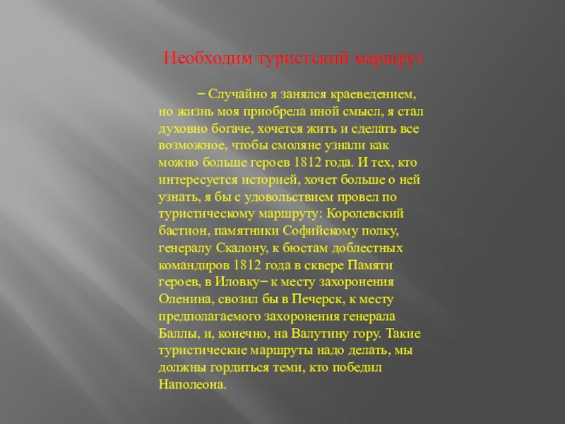 я занялся краеведением, но жизнь моя приобрела иной смысл, я стал духовно богаче, хочется жить и сделать все возможное, чтобы смоляне узнали как можно больше героев 1812 года. И тех, кто интересуется историей, хочет больше о ней узнать, я бы с удовольствием провел по туристическому маршруту: Королевский бастион, памятники Софийскому полку, генералу Скалону, к бюстам доблестных командиров 1812 года в сквере Памяти героев, в Иловку ̶ к месту захоронения Оленина, свозил бы в Печерск, к месту предполагаемого захоронения генерала Баллы, и, конечно, на Валутину гору. Такие туристические маршруты надо делать, мы должны гордиться теми, кто победил Наполеона.