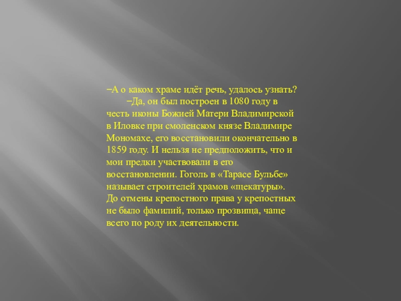 ̶ Да, он был построен в 1080 году в честь иконы Божией Матери Владимирской в Иловке при смоленском князе Владимире Мономахе, его восстановили окончательно в 1859 году. И нельзя не предположить, что и мои предки участвовали в его восстановлении. Гоголь в «Тарасе Бульбе» называет строителей храмов «щекатуры». До отмены крепостного права у крепостных не было фамилий, только прозвища, чаще всего по роду их деятельности.