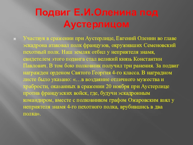 Слайд 30Подвиг Е.И.Оленина под Аустерлицом