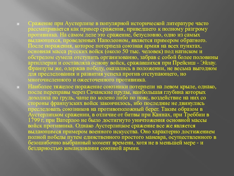 Наиболее тяжелое поражение союзники потерпели на левом крыле, однако, после переправы через Сачанские пруды, наибольшая глубина которых доходила по грудь, чаще по колено либо по пояс, воздействие на них со стороны французских войск закончилось, ибо последние не двинулись преследовать союзников на противоположный берег. Таким образом в Аустерлицком сражении, в отличие от битвы при Каннах, при Треббии в 1799 г, при Ватерлоо не было достигнуто уничтожения основной массы войск противника. Однако Аустерлицкое сражение все же является выдающимся примером военного искусства. Оно характерно достижением полной победы путем единственного простого маневра, осуществленного в безошибочно выбранный момент времени, хотя не в меньшей мере - и бездарностью командования союзной армии.
