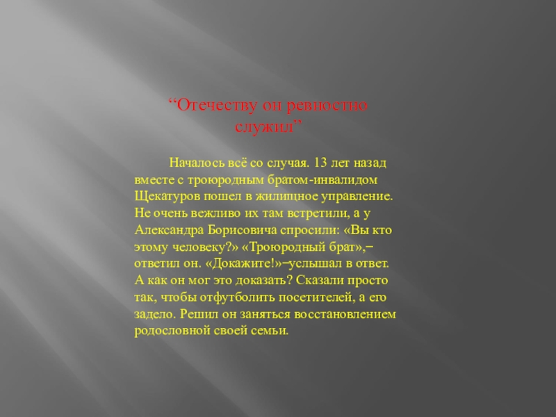 случая. 13 лет назад вместе с троюродным братом-инвалидом Щекатуров пошел в жилищное управление. Не очень вежливо их там встретили, а у Александра Борисовича спросили: «Вы кто этому человеку?» «Троюродный брат», ̶ ответил он. «Докажите!» ̶ услышал в ответ. А как он мог это доказать? Сказали просто так, чтобы отфутболить посетителей, а его задело. Решил он заняться восстановлением родословной своей семьи.