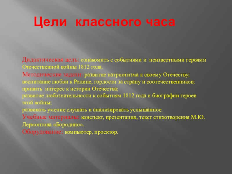 Учебные материалы: конспект, презентация, текст стихотворения М.Ю. Лермонтова «Бородино».