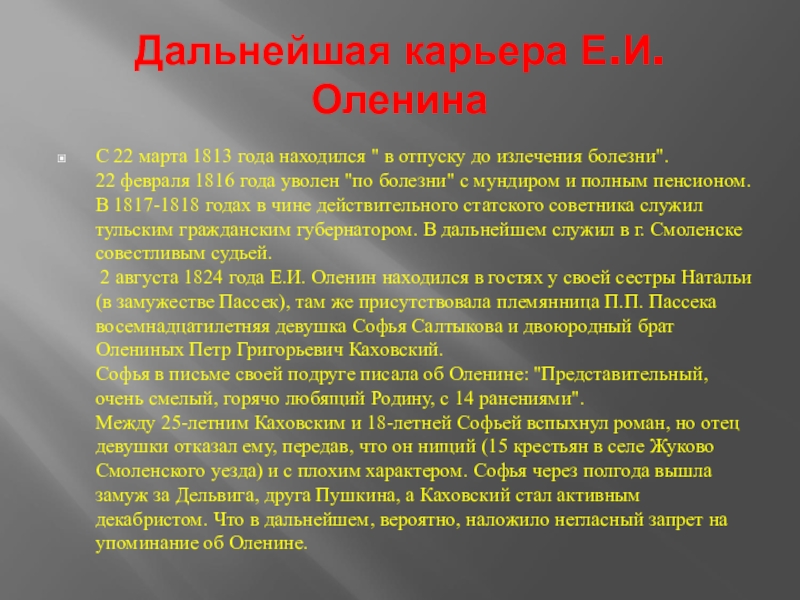 2 августа 1824 года Е.И. Оленин находился в гостях у своей сестры Натальи (в замужестве Пассек), там же присутствовала племянница П.П. Пассека восемнадцатилетняя девушка Софья Салтыкова и двоюродный брат Олениных Петр Григорьевич Каховский.