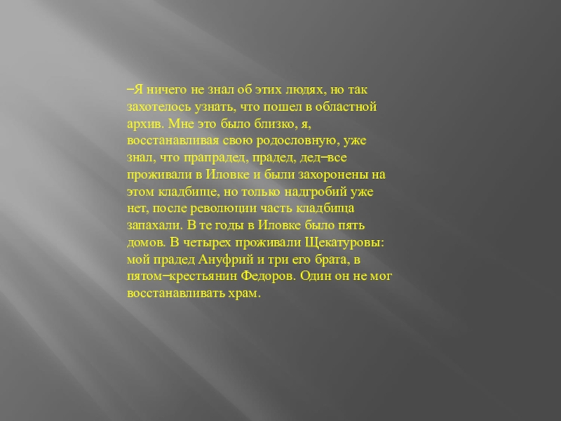 захотелось узнать, что пошел в областной архив. Мне это было близко, я, восстанавливая свою родословную, уже знал, что прапрадед, прадед, дед ̶ все проживали в Иловке и были захоронены на этом кладбище, но только надгробий уже нет, после революции часть кладбища запахали. В те годы в Иловке было пять домов. В четырех проживали Щекатуровы: мой прадед Ануфрий и три его брата, в пятом ̶ крестьянин Федоров. Один он не мог восстанавливать храм.